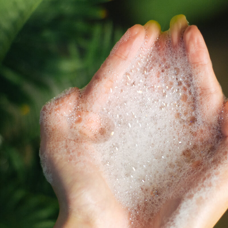 綠藤耗時 2 年研發,針對溫和度、清潔力、起泡性、生物可分解度等六大面向深入研究,從 2,000 多種排列組合中,極淬出針對染燙過、受損髮質所需的 6 種高親膚、溫和天然潔淨複方。